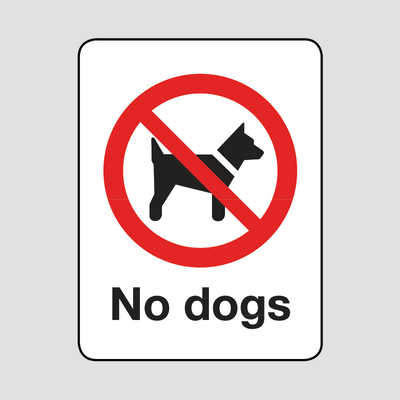 Prohibition – No dogs symbol. General prohibition used to clearly mark restricted areas in and around your building. Available in aluminium, rigid plastic and self adhesive vinyl (polycarbonate on request) to suit your needs. Available in a variety of sizes. All of our prohibition safety signs are fully compliant with ISO 7010.
