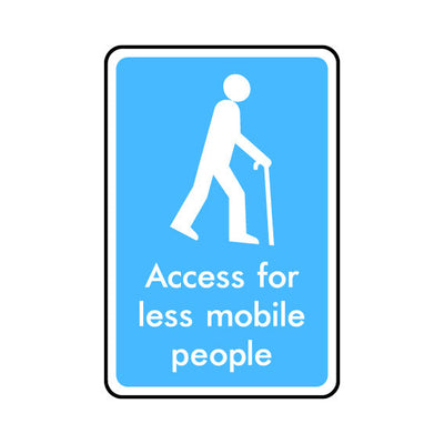 The Access For Less Mobile People sign falls under the Information Signs category. This sign is commonly used in various settings, including workplaces, schools, and public spaces, to enhance safety and compliance. This sign complies with UK health and safety standards, including BS ISO 7010, e