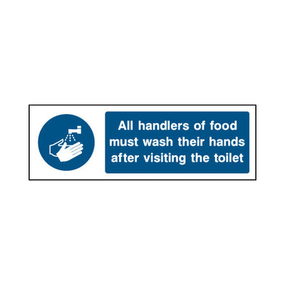 The All Handlers Of Food Must Wash Their Hands After Visiting The Toilet sign falls under the Food Processing & Hygeine category. This sign is commonly used in various settings, including workplaces, schools, and public spaces, to enhance safety and compliance. This sign complies with UK hea