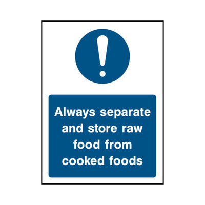 The Always Separate And Store Raw Food From Cooked Foods sign falls under the Food Processing & Hygeine category. This sign is commonly used in various settings, including workplaces, schools, and public spaces, to enhance safety and compliance. This sign complies with UK health and safety s