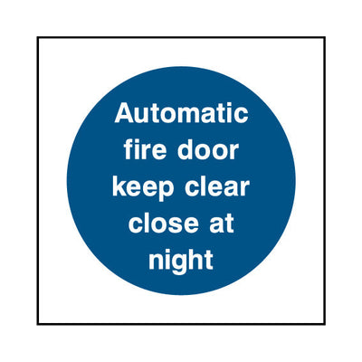 The Automatic Fire Door Keep Clear Close At Night sign falls under the Fire Prevention category. This sign is commonly used in various settings, including workplaces, schools, and public spaces, to enhance safety and compliance. This sign complies with UK health and safety standards, including B