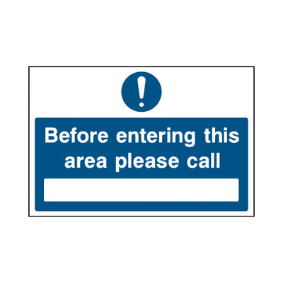 The Before Entering This Area Please Call sign falls under the Construction category. This sign is commonly used in various settings, including workplaces, schools, and public spaces, to enhance safety and compliance. This sign complies with UK health and safety standards, including BS ISO 7010,