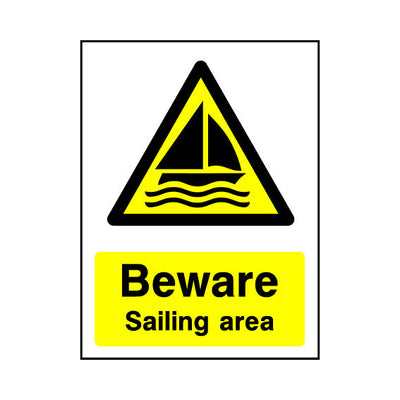 The Beware - Sailing Area sign falls under the Water Safety category. This sign is commonly used in various settings, including workplaces, schools, and public spaces, to enhance safety and compliance. This sign complies with UK health and safety standards, including BS ISO 7010, ensuring that i