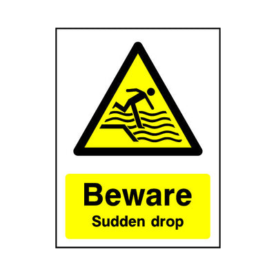 The Beware - Sudden Drop sign falls under the Water Safety category. This sign is commonly used in various settings, including workplaces, schools, and public spaces, to enhance safety and compliance. This sign complies with UK health and safety standards, including BS ISO 7010, ensuring that it