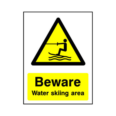The Beware - Water Skiing Area sign falls under the Water Safety category. This sign is commonly used in various settings, including workplaces, schools, and public spaces, to enhance safety and compliance. This sign complies with UK health and safety standards, including BS ISO 7010, ensuring t
