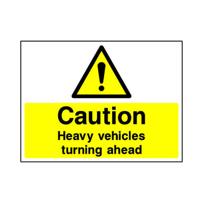 The Caution Heavy Vehicles Turning Ahead sign falls under the Construction category. Ideal for use in car parks, driveways, and loading bays to manage vehicle access and prevent obstructions. This sign complies with UK health and safety standards, including BS ISO 7010, ensuring that it meets le