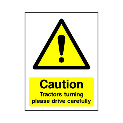 The Caution - Tractors Turning - Please Drive Carefully sign falls under the Countryside & Agriculture category. This sign is commonly used in various settings, including workplaces, schools, and public spaces, to enhance safety and compliance. This sign complies with UK health and safety st