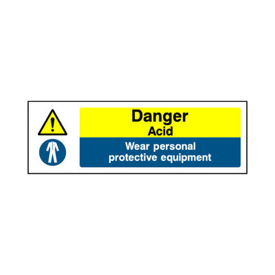 The Danger - Acid - Wear PPE sign falls under the Chemical Danger category. This sign is commonly used in various settings, including workplaces, schools, and public spaces, to enhance safety and compliance. This sign complies with UK health and safety standards, including BS ISO 7010, ensuring