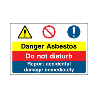 The Danger Asbestos - Do Not Disturb - Report Damage sign falls under the Construction category. This sign is commonly used in various settings, including workplaces, schools, and public spaces, to enhance safety and compliance. This sign complies with UK health and safety standards, including B