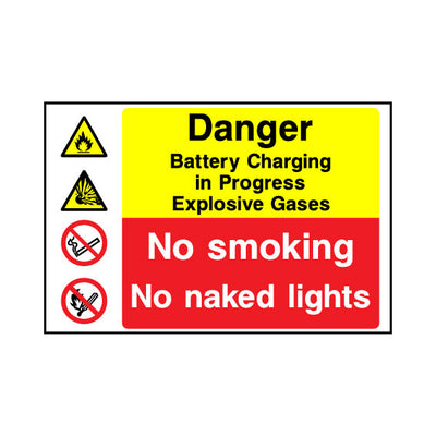 The Danger - Battery Charging In Progress - Explosive Gases - No Smoking - No Naked Lights sign falls under the Multi Purpose category. Essential for hospitals, schools, and public spaces to enforce smoke-free policies and comply with the Health Act 2006. This sign complies with UK health and sa