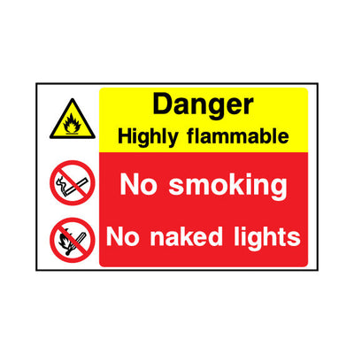 The Danger - Highly Flammable - No Smoking - No Naked Lights sign falls under the Multi Purpose category. Essential for hospitals, schools, and public spaces to enforce smoke-free policies and comply with the Health Act 2006. This sign complies with UK health and safety standards, including BS I
