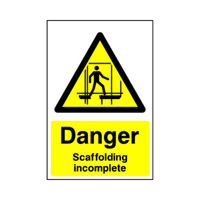 The Danger - Scaffolding Incomplete sign falls under the Construction category. This sign is commonly used in various settings, including workplaces, schools, and public spaces, to enhance safety and compliance. This sign complies with UK health and safety standards, including BS ISO 7010, ensur