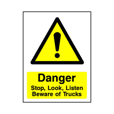 The Danger - Stop, Look, Listen - Beware Of Trucks sign falls under the General Warning category. This sign is commonly used in various settings, including workplaces, schools, and public spaces, to enhance safety and compliance. This sign complies with UK health and safety standards, including