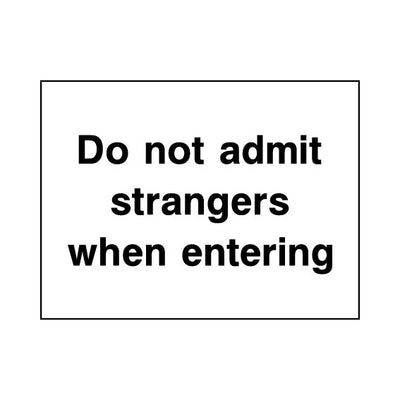 The Do Not Admit Strangers When Entering sign falls under the Security category. This sign is commonly used in various settings, including workplaces, schools, and public spaces, to enhance safety and compliance. This sign complies with UK health and safety standards, including BS ISO 7010, ensu