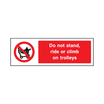 The Do Not Stand, Ride Or Climb On Trolleys sign falls under the General Prohibition category. This sign is commonly used in various settings, including workplaces, schools, and public spaces, to enhance safety and compliance. This sign complies with UK health and safety standards, including BS