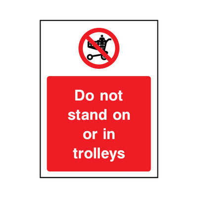 The Do Not Stand, Ride Or Climb On Trolleys sign falls under the General Prohibition category. This sign is commonly used in various settings, including workplaces, schools, and public spaces, to enhance safety and compliance. This sign complies with UK health and safety standards, including BS