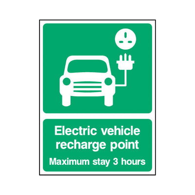 The Electric Vehicle Recharge Point - Maximum Stay 3 Hours sign falls under the Parking category. This sign is commonly used in various settings, including workplaces, schools, and public spaces, to enhance safety and compliance. This sign complies with UK health and safety standards, including