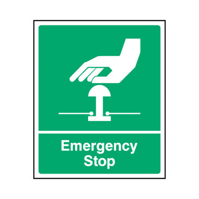 The Emergency Stop (green) sign falls under the First Aid category. This sign is commonly used in various settings, including workplaces, schools, and public spaces, to enhance safety and compliance. This sign complies with UK health and safety standards, including BS ISO 7010, ensuring that it