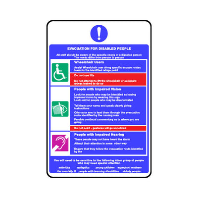 The Evacuation For Disabled People - Information sign falls under the DDA Act category. This sign is commonly used in various settings, including workplaces, schools, and public spaces, to enhance safety and compliance. This sign complies with UK health and safety standards, including BS ISO 701
