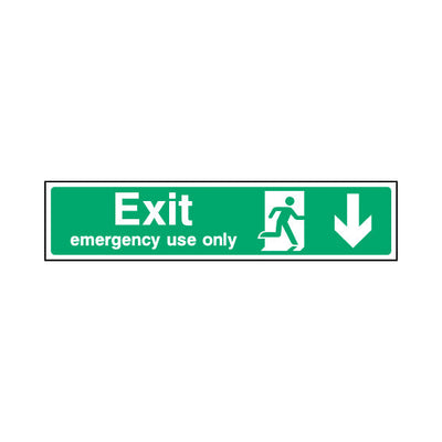 The Exit - Emergency Une Only Arrow Down sign falls under the Emergency Escape category. This sign is commonly used in various settings, including workplaces, schools, and public spaces, to enhance safety and compliance. This sign complies with UK health and safety standards, including BS ISO 70