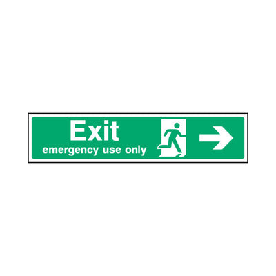 The Exit - Emergency Une Only Arrow Right sign falls under the Emergency Escape category. This sign is commonly used in various settings, including workplaces, schools, and public spaces, to enhance safety and compliance. This sign complies with UK health and safety standards, including BS ISO 7