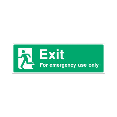 The Exit - For Emergency Use Only sign falls under the Emergency Escape category. This sign is commonly used in various settings, including workplaces, schools, and public spaces, to enhance safety and compliance. This sign complies with UK health and safety standards, including BS ISO 7010, ens
