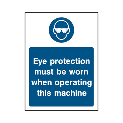 The Eye Protection Must Be Worn When Operating This Machine sign falls under the Personal Protective Equipment category. This sign is commonly used in various settings, including workplaces, schools, and public spaces, to enhance safety and compliance. This sign complies with UK health and safet