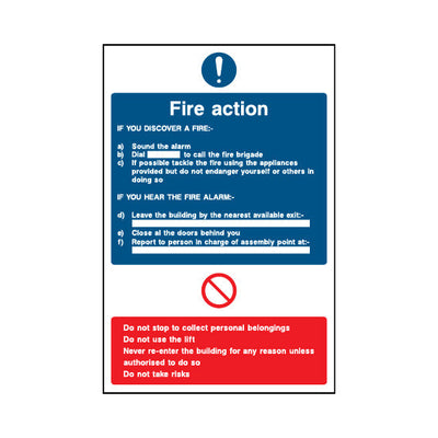 The Fire Action (v15) sign falls under the Fire Action category. This sign is commonly used in various settings, including workplaces, schools, and public spaces, to enhance safety and compliance. This sign complies with UK health and safety standards, including BS ISO 7010, ensuring that it mee