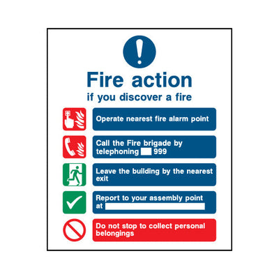 The Fire Action (v8) sign falls under the Fire Action category. This sign is commonly used in various settings, including workplaces, schools, and public spaces, to enhance safety and compliance. This sign complies with UK health and safety standards, including BS ISO 7010, ensuring that it meet