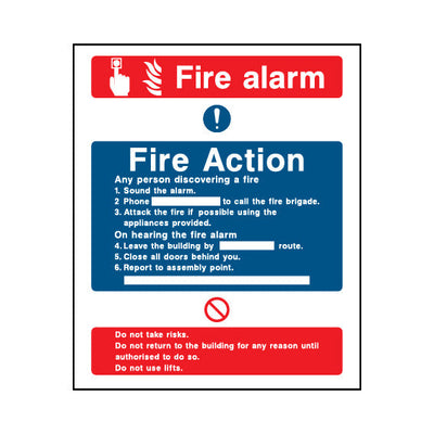The Fire Alarm & Fire Action sign falls under the Fire Action category. This sign is commonly used in various settings, including workplaces, schools, and public spaces, to enhance safety and compliance. This sign complies with UK health and safety standards, including BS ISO 7010, ensuring