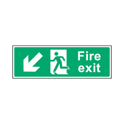 The Fire Exit Diagonal Arrow Left (down) sign falls under the Emergency Escape category. This sign is commonly used in various settings, including workplaces, schools, and public spaces, to enhance safety and compliance. This sign complies with UK health and safety standards, including BS ISO 70