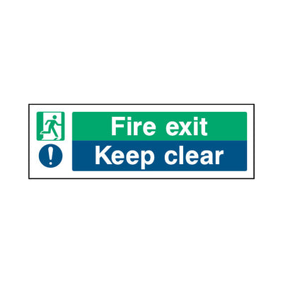 The Fire Exit - Keep Clear sign falls under the Emergency Escape category. This sign is commonly used in various settings, including workplaces, schools, and public spaces, to enhance safety and compliance. This sign complies with UK health and safety standards, including BS ISO 7010, ensuring t