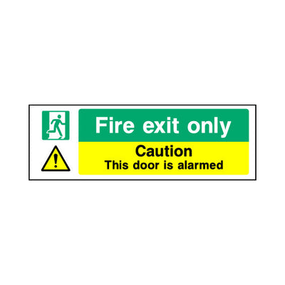 The Fire Exit Only - Caution - This Door Is Alarmed sign falls under the Security category. This sign is commonly used in various settings, including workplaces, schools, and public spaces, to enhance safety and compliance. This sign complies with UK health and safety standards, including BS ISO