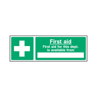 The First Aid For This Dept. Is Available From… sign falls under the First Aid category. This sign is commonly used in various settings, including workplaces, schools, and public spaces, to enhance safety and compliance. This sign complies with UK health and safety standards, including BS ISO 70