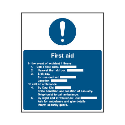 The First Aid Notice - In The Event Of Accident Or Illness… sign falls under the First Aid category. This sign is commonly used in various settings, including workplaces, schools, and public spaces, to enhance safety and compliance. This sign complies with UK health and safety standards, including BS ISO 7010, ensuring that it meets legal requirements for safety signage. By displaying this sign, you contribute to creating a safer environment while adhering to regulations. At One Printer, we make it easy to order the exact product you need. You can select from a range of materials and finishing options to suit your specific requirements. Our available materials include 1mm PVC, 3mm Foamex, 3mm Dibond, self-adhesive vinyl, anti-slip floor graphics, and removable magnetic. Finishing options include 3M double-sided tape or drill holes for easy installation. With One Printer, you can be confident that your signage meets the highest standards of safety, durability, and customisation, all backed by our expert customer support team. H&S Sign Product Code: FAD041.