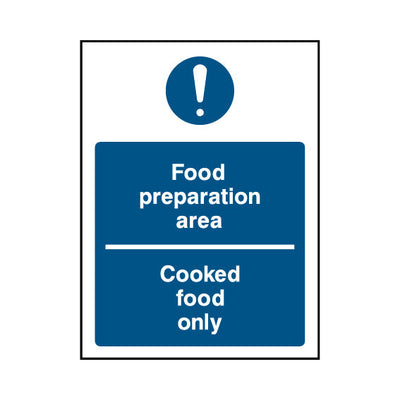 The Food Preparation Area - Cooked Food Only sign falls under the Food Processing & Hygeine category. This sign is commonly used in various settings, including workplaces, schools, and public spaces, to enhance safety and compliance. This sign complies with UK health and safety standards, in