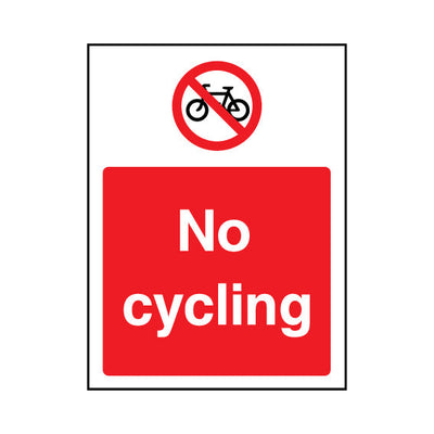 The No Cycling sign falls under the General Prohibition category. This sign is commonly used in various settings, including workplaces, schools, and public spaces, to enhance safety and compliance. This sign complies with UK health and safety standards, including BS ISO 7010, ensuring that it me