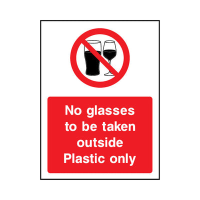 The No Glasses To Be Taken Outside - Plastic Only sign falls under the General Prohibition category. This sign is commonly used in various settings, including workplaces, schools, and public spaces, to enhance safety and compliance. This sign complies with UK health and safety standards, includi