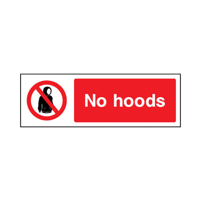 The No Hoods sign falls under the General Prohibition category. This sign is commonly used in various settings, including workplaces, schools, and public spaces, to enhance safety and compliance. This sign complies with UK health and safety standards, including BS ISO 7010, ensuring that it meet