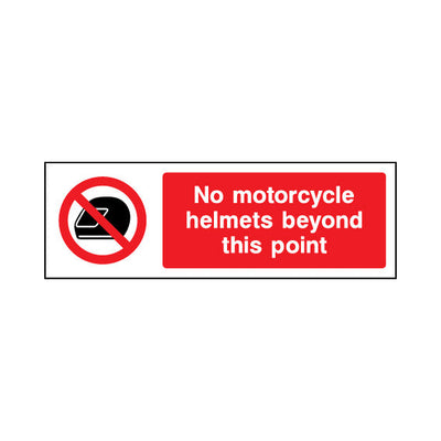 The No Motorcycle Helmets Beyond This Point sign falls under the General Prohibition category. This sign is commonly used in various settings, including workplaces, schools, and public spaces, to enhance safety and compliance. This sign complies with UK health and safety standards, including BS