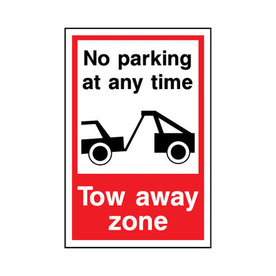 The No Parking At Any Time - Tow Away Zone sign falls under the Parking category. Ideal for use in car parks, driveways, and loading bays to manage vehicle access and prevent obstructions. This sign complies with UK health and safety standards, including BS ISO 7010, ensuring that it meets legal