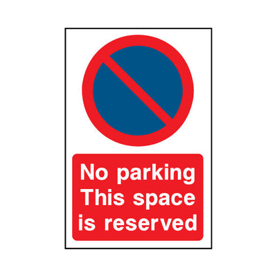 The No Parking - This Space Is Reserved sign falls under the Parking category. Ideal for use in car parks, driveways, and loading bays to manage vehicle access and prevent obstructions. This sign complies with UK health and safety standards, including BS ISO 7010, ensuring that it meets legal re