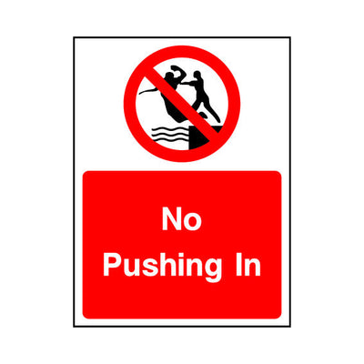 The No Pushing In sign falls under the Water Safety category. This sign is commonly used in various settings, including workplaces, schools, and public spaces, to enhance safety and compliance. This sign complies with UK health and safety standards, including BS ISO 7010, ensuring that it meets