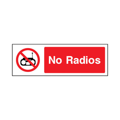 The No Radios sign falls under the General Prohibition category. This sign is commonly used in various settings, including workplaces, schools, and public spaces, to enhance safety and compliance. This sign complies with UK health and safety standards, including BS ISO 7010, ensuring that it mee