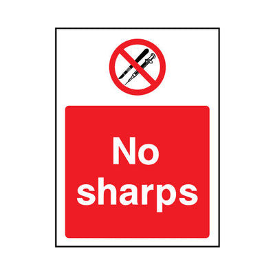 The No Sharps sign falls under the General Prohibition category. This sign is commonly used in various settings, including workplaces, schools, and public spaces, to enhance safety and compliance. This sign complies with UK health and safety standards, including BS ISO 7010, ensuring that it mee