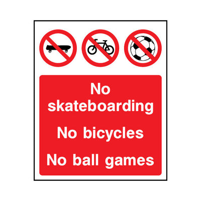 The No Skateboarding - No Bicycles - No Ball Games sign falls under the Parks & Play category. This sign is commonly used in various settings, including workplaces, schools, and public spaces, to enhance safety and compliance. This sign complies with UK health and safety standards, including