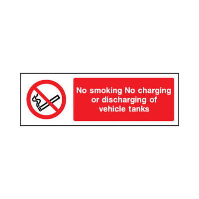 The No Smoking - No Charging Or Discharging Of Vehicle Tank sign falls under the Smoking Prohibition category. Essential for hospitals, schools, and public spaces to enforce smoke-free policies and comply with the Health Act 2006. This sign complies with UK health and safety standards, including
