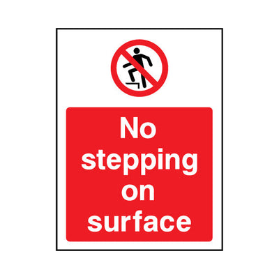 The No Stepping On Surface sign falls under the General Prohibition category. This sign is commonly used in various settings, including workplaces, schools, and public spaces, to enhance safety and compliance. This sign complies with UK health and safety standards, including BS ISO 7010, ensurin