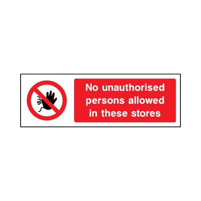 The No Unauthorised Persons Allowed In These Stores sign falls under the Access Restricted category. This sign is commonly used in various settings, including workplaces, schools, and public spaces, to enhance safety and compliance. This sign complies with UK health and safety standards, includi