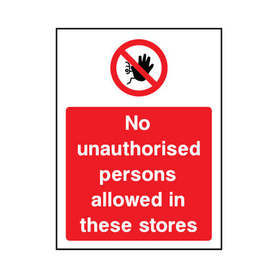 The No Unauthorised Persons Allowed In These Stores sign falls under the Access Restricted category. This sign is commonly used in various settings, including workplaces, schools, and public spaces, to enhance safety and compliance. This sign complies with UK health and safety standards, includi